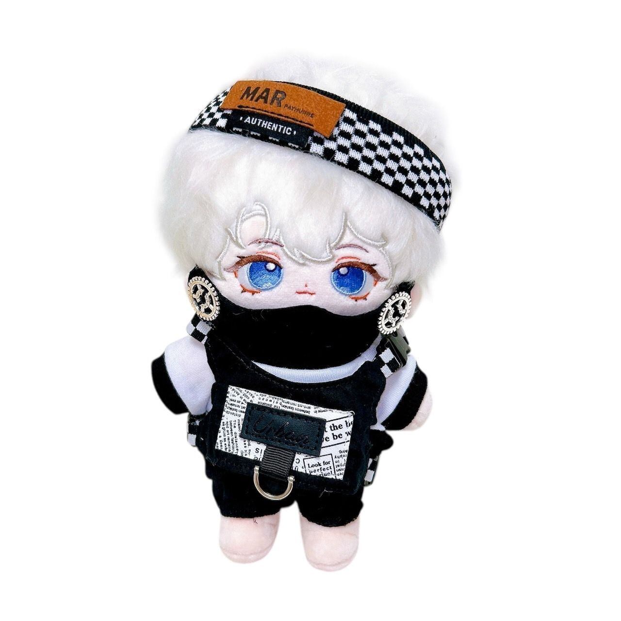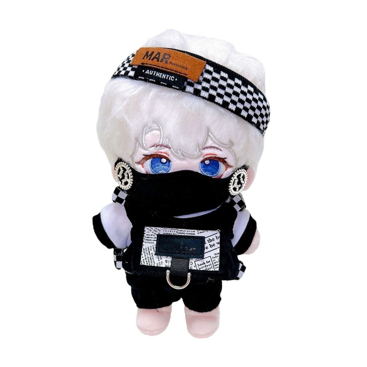 【20cm】ぬい服 おしゃれ ストリート系 ヘッドバンド マスク付き ブラック 黒色 全身コーデ 韓国風 小物 ライブ アイドル 音楽 ぬいぐるみ用 服 着ぐるみ ぬい 日常服人形 ファッション 着せ替え 萌え ぬい活 推しぬい 棉花娃娃 推し活