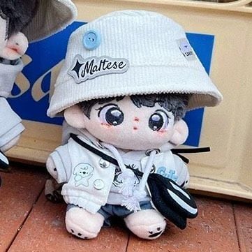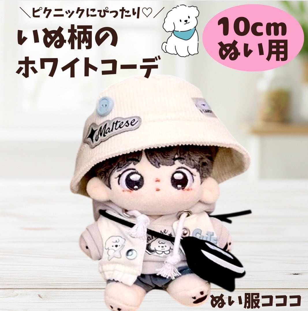 ぬい服 【10cm】白の犬柄 ストリートコーデ ポシェット付き バケットハット ぬいぐるみ 全身 ちびぐるみ にじぱぺっと いつぬい あんスタ 10~12cm 韓国 ぬい活