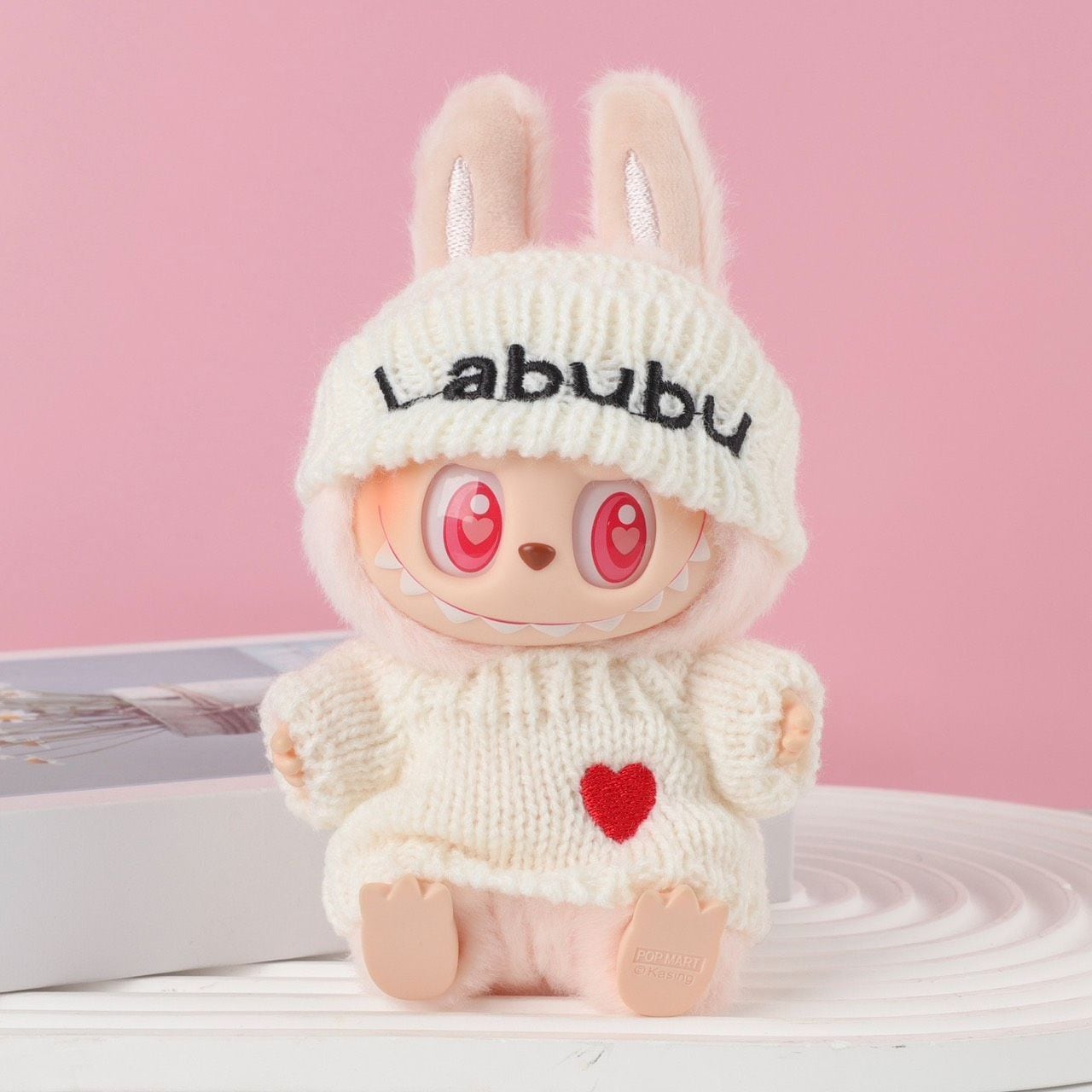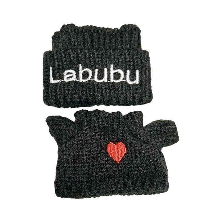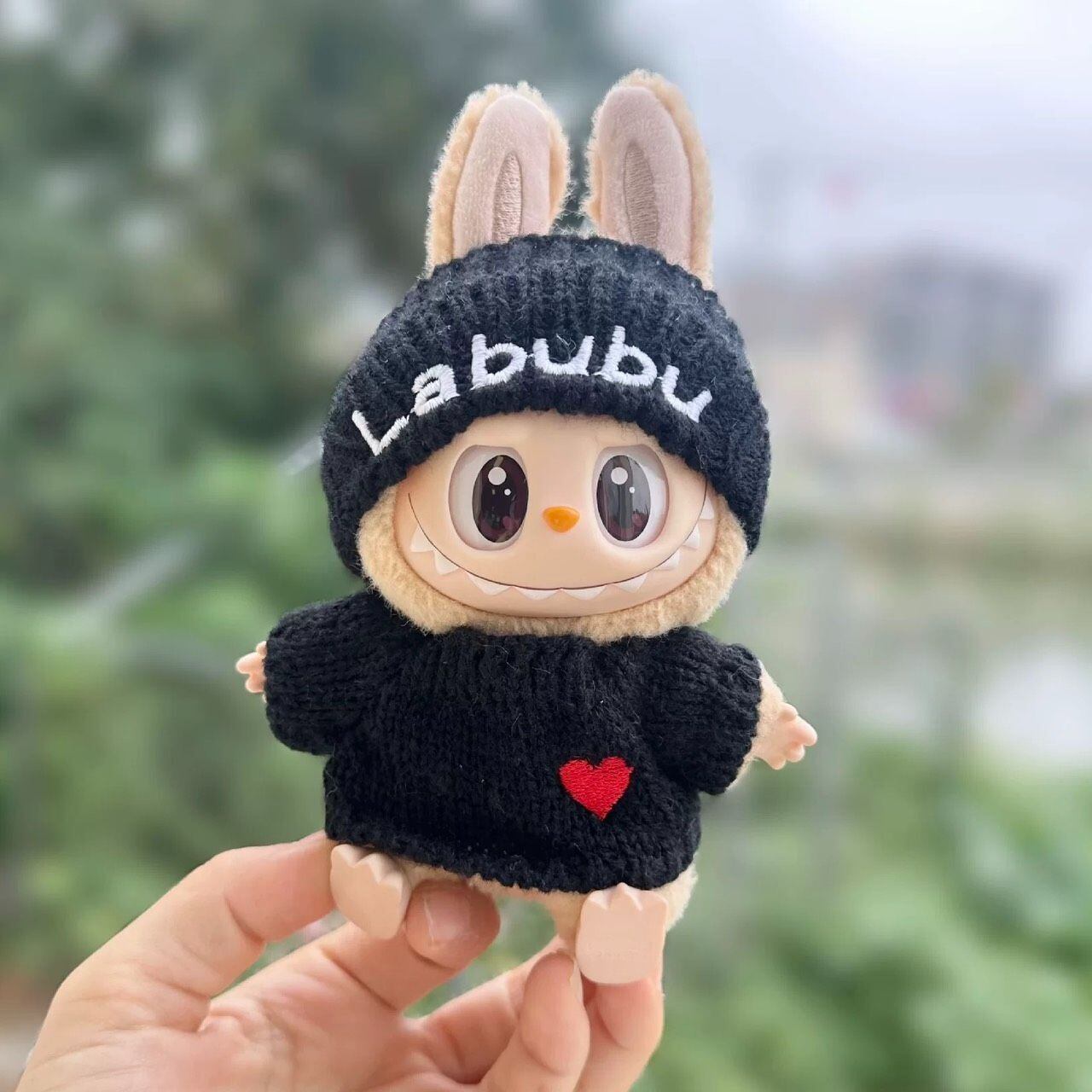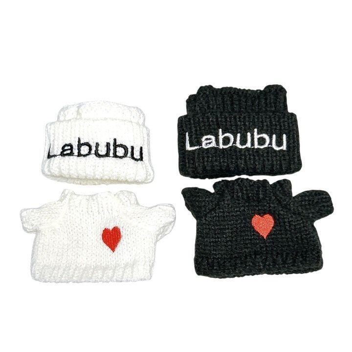 LABUBU 着せ替え 17cm ラブブ服 ブラック 黒 ホワイト 白 ロゴ刺繡入り セーター、ニット帽セット D493