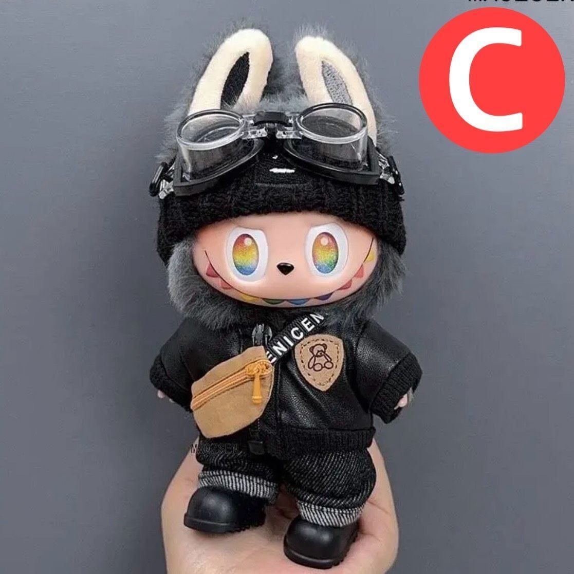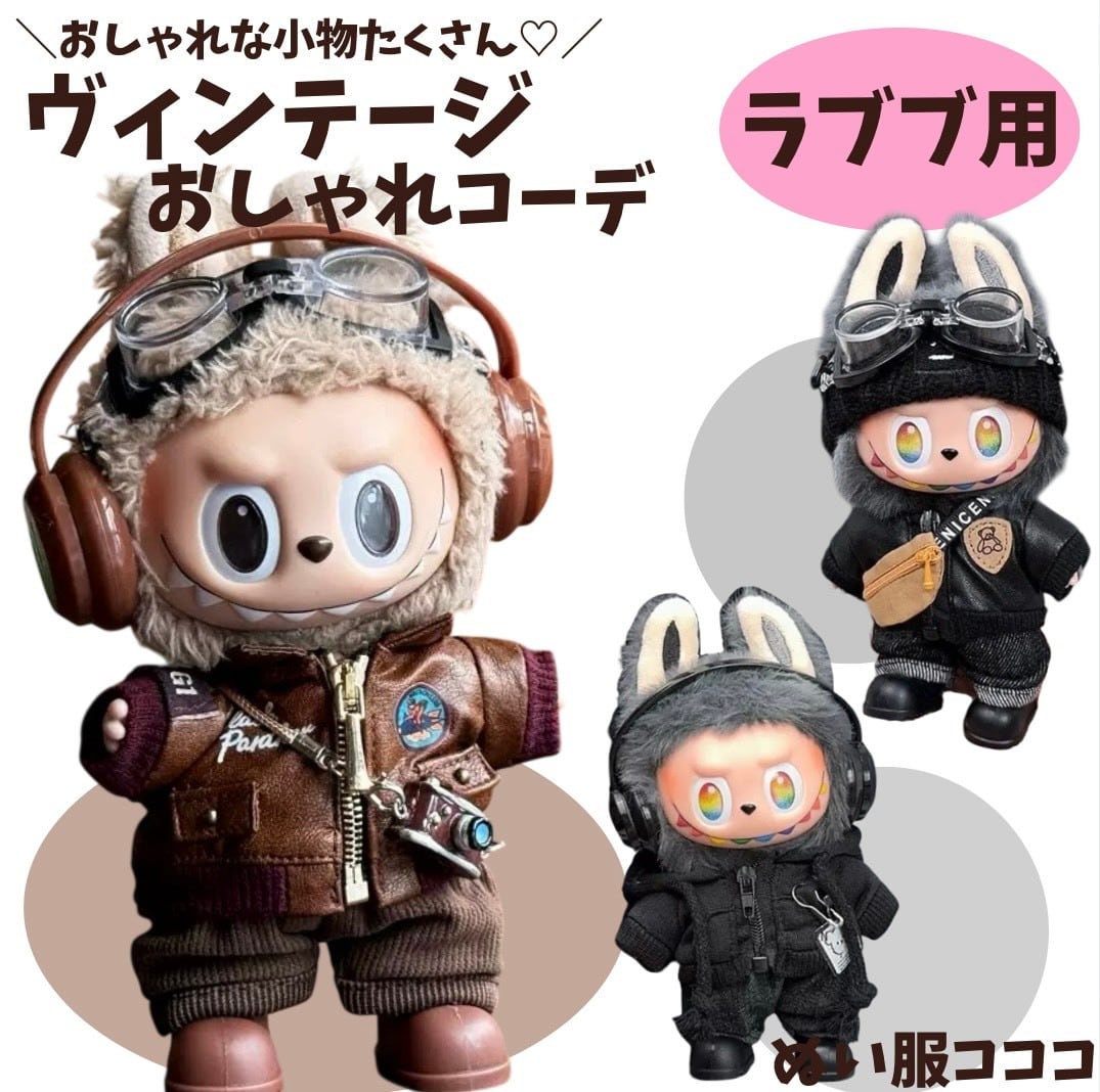 ラブブ用 ぬいぐるみ服 ジャケット 着せ替え服セット ブラック ブラウン 黒 茶 ズボン 靴 ヘッドフォン ゴーグル ショルダーバッグ おしゃれ 大人気 LABUBU 推しぬい ドール服 ぬい活 推し活 ぬい撮り ぬい服コココ Z394