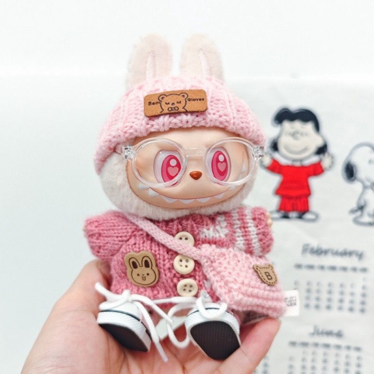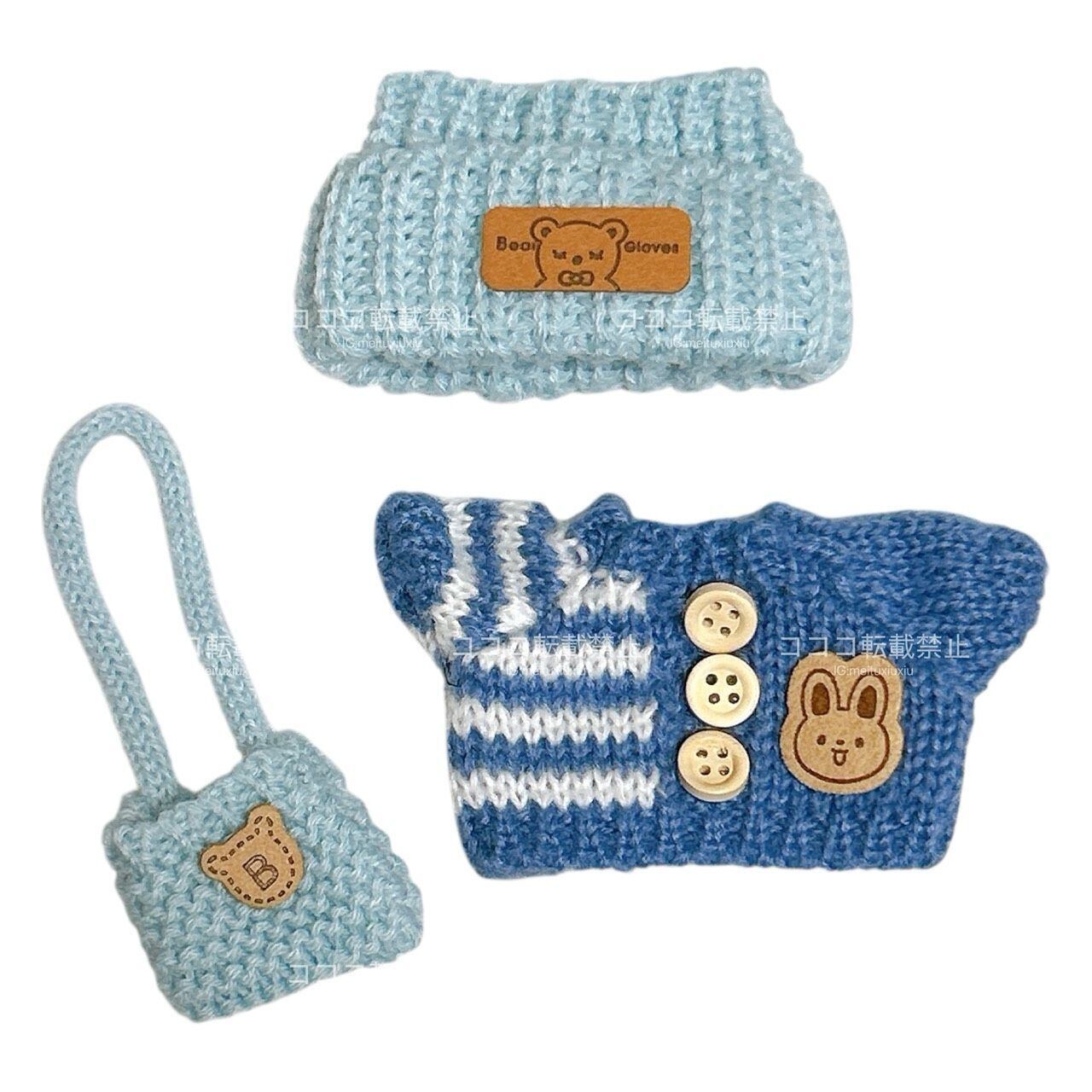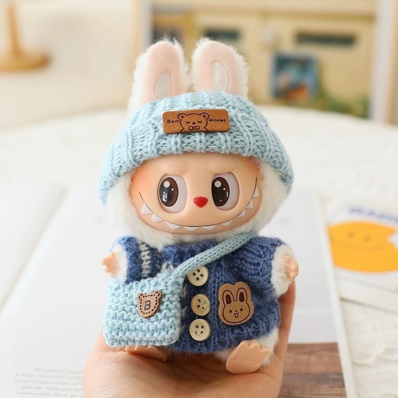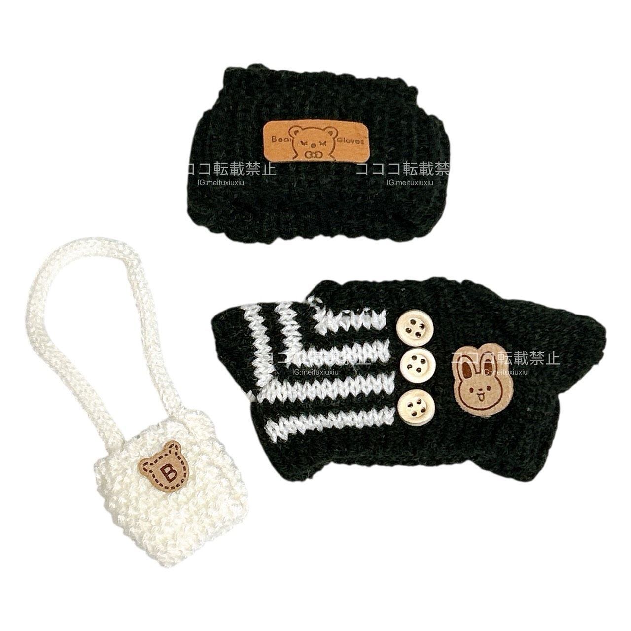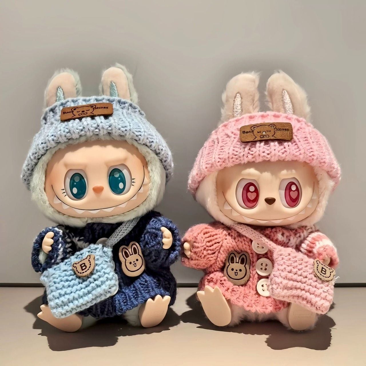 LABUBU ラブブ ぬいぐるみ用 ドール服 3色 手編み セーター ニット サロペット ニット帽 ニットバッグ 着せ替え衣装 コスチューム 15〜17cm 毛糸 一代二代三代 人形 アクセサリー マカロン ハブシ エナジー ぬい服コココ D382