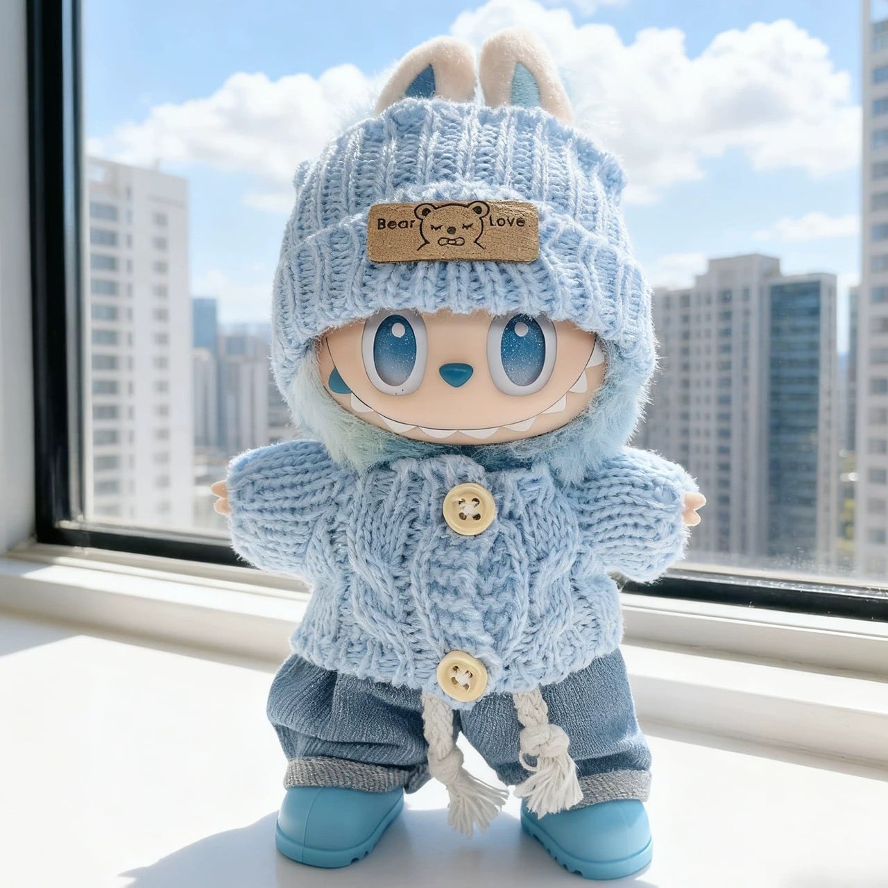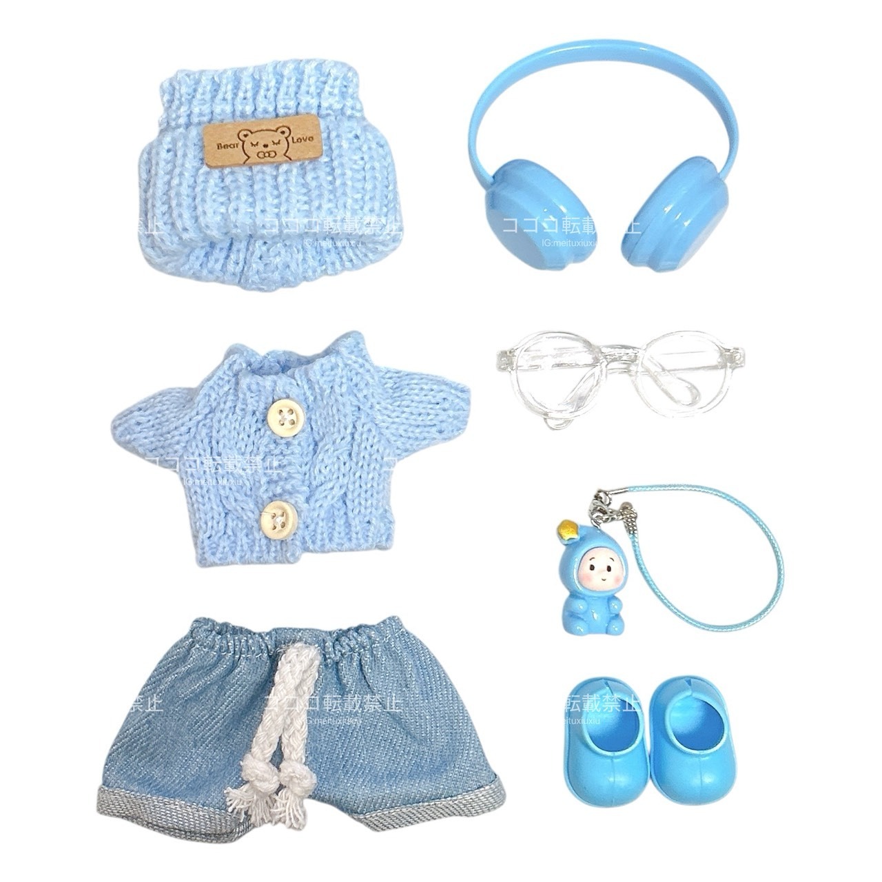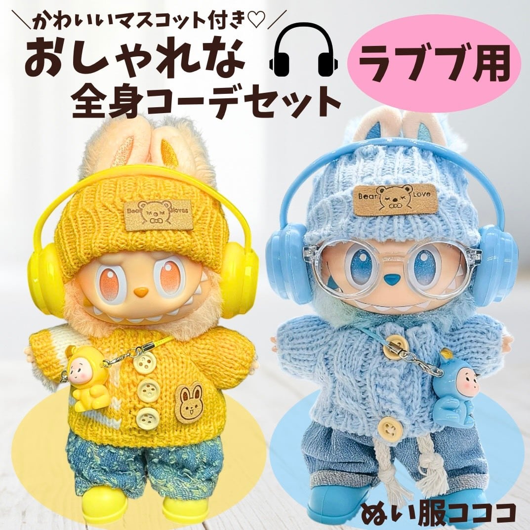 LABUBU ラブブ おしゃれなストリート全身コーデ イエロー ブルー 着せ替えコスチューム 眼鏡 靴 ニット帽 セーター ズボン ヘッドフォン ぬい撮り ぬい活 ぬいぐるみ ドール服 海外 かわいい 13世代 マカロン エナジー ぬい服コココ P373