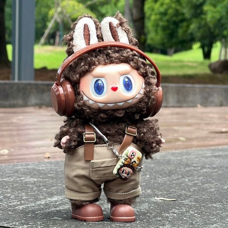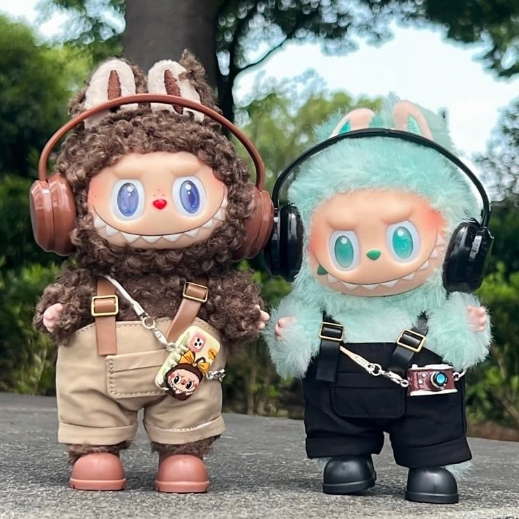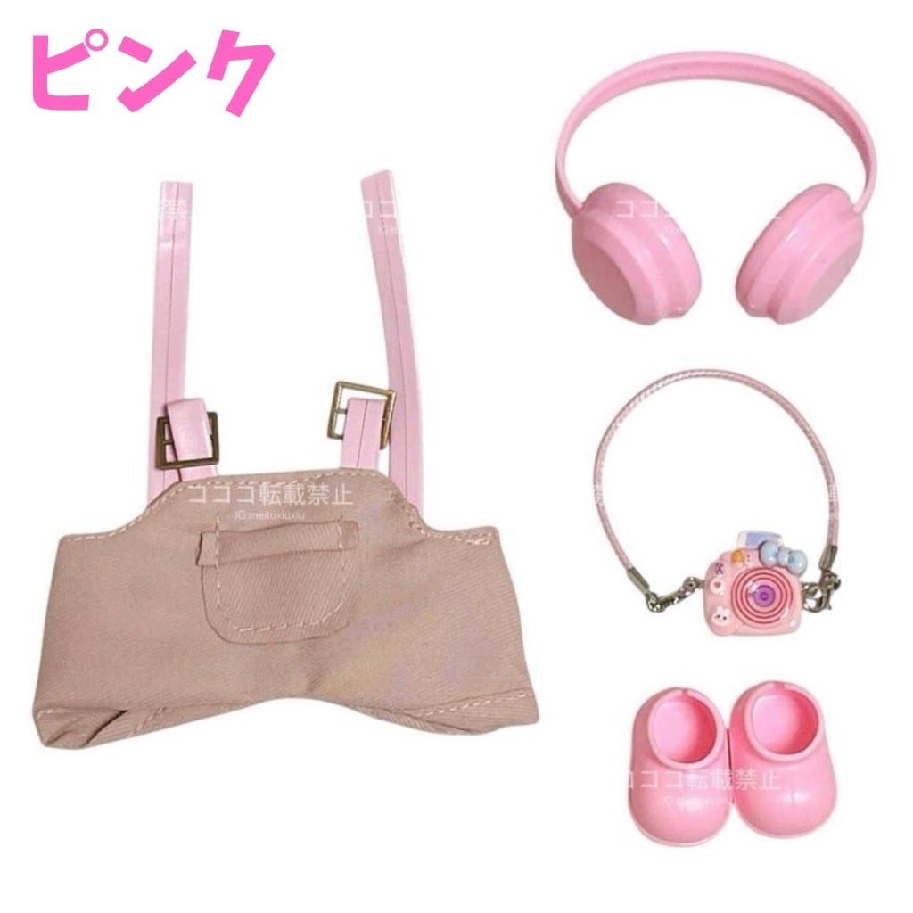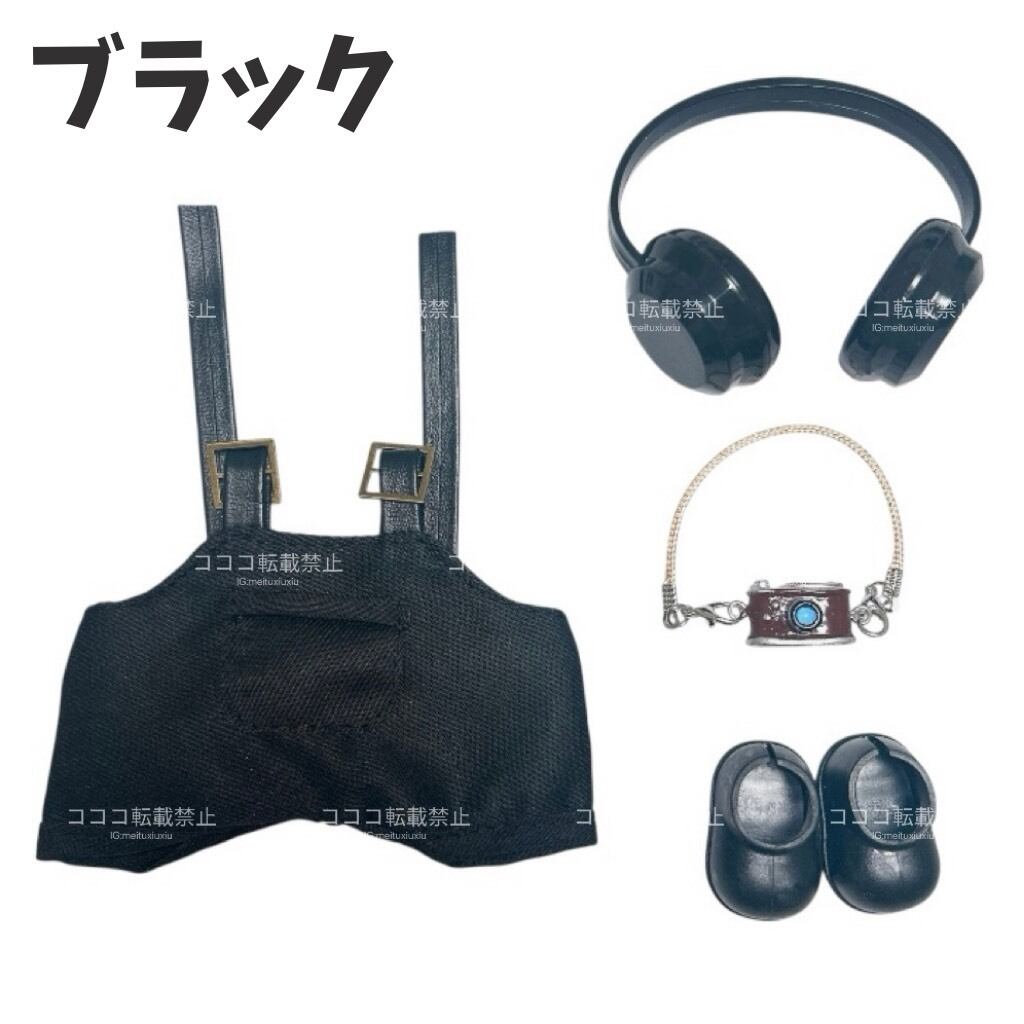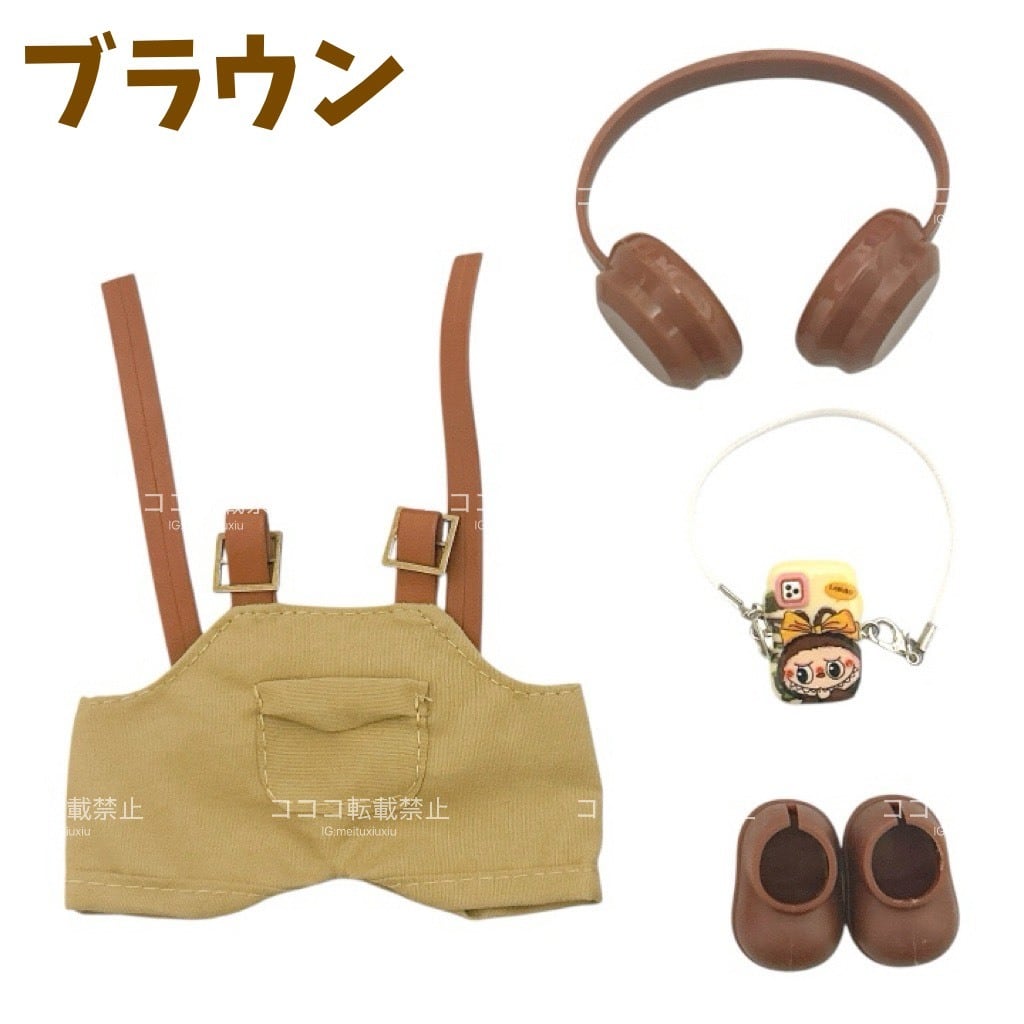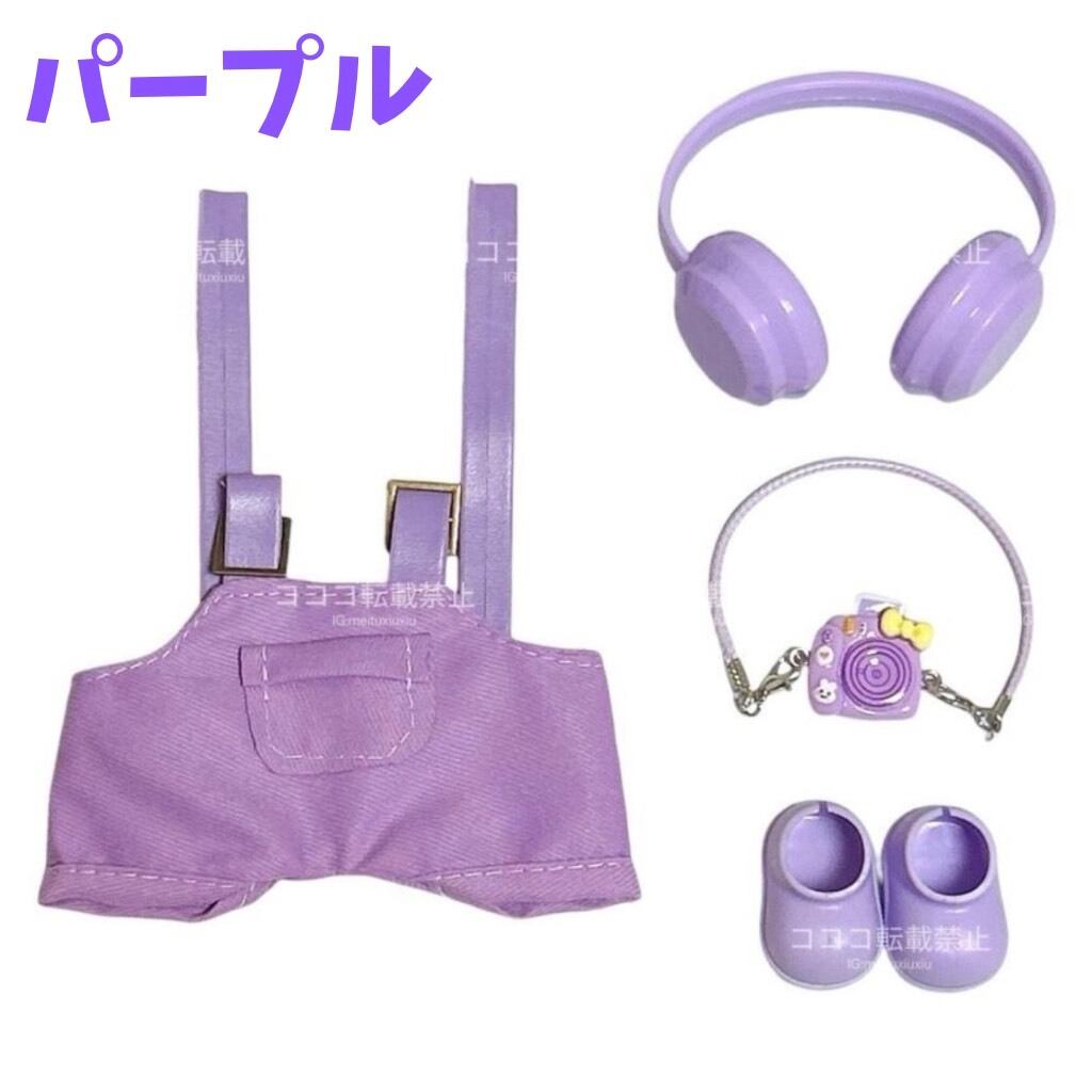 ラブブ服 labubu ヘッドフォン付きオーバーオールコーデ カメラ 靴 着せ替えコスチューム セット パープル ピンク ブラウン ブラック 紫 黒 茶 ズボン ぬい撮り ぬい活 ぬいぐるみコーデ ドール服 海外 かわいい マカロン エナジー ぬい服コココ