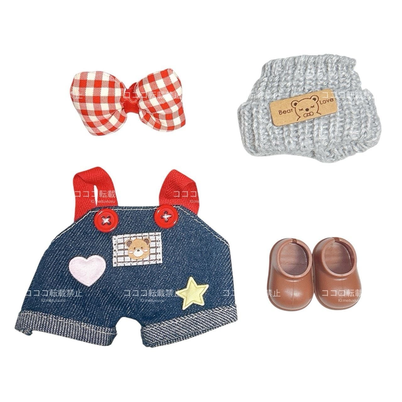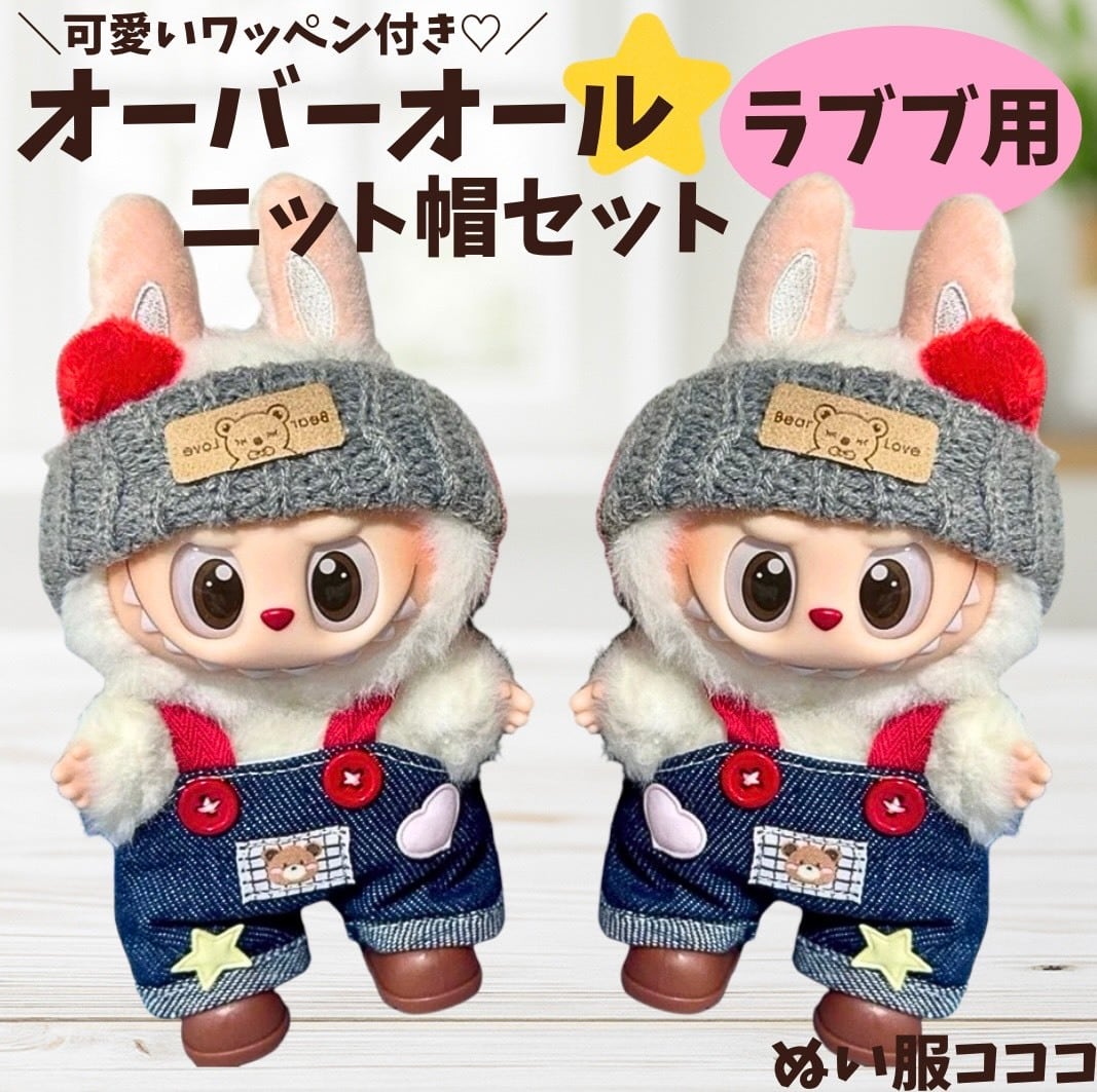 ラブブ服 labubu ワッペン付きオーバーオールサロペ ニット帽 靴 リボン くま ハート 星 着せ替えコスチューム セット デニム ズボン ぬい撮り ぬい活 ぬいぐるみコーデ ドール服 海外 かわいい マカロン エナジー ぬい服コココ