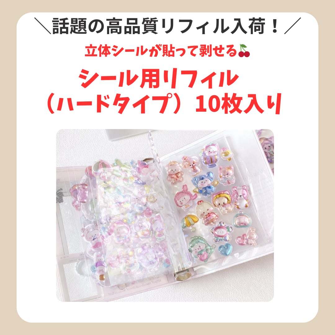厚みのある立体シールやぷっくりシールの保管に適した、透明タイプの両面リフィルです。