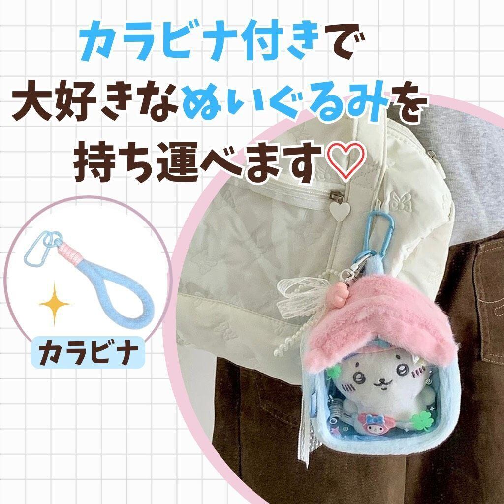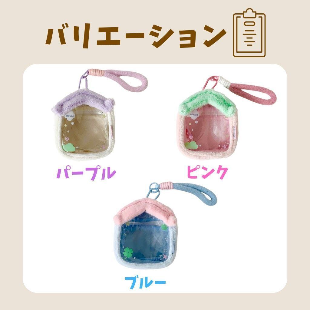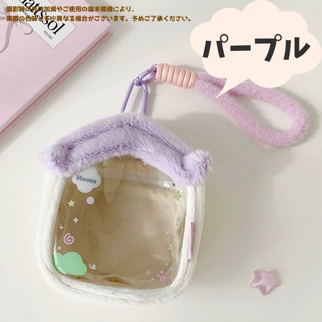 ハウス型 ぬいぐるみポーチ 持ち運び バッグ 透明 痛バッグ クリア 推し活 オタ活 収納 保護 アイドル アニメ マスコット 人形 ぬいポーチ ぬいぐるみ用 お家 5cmー10cm用 カラビナ付き 3色 紫 ピンク 青