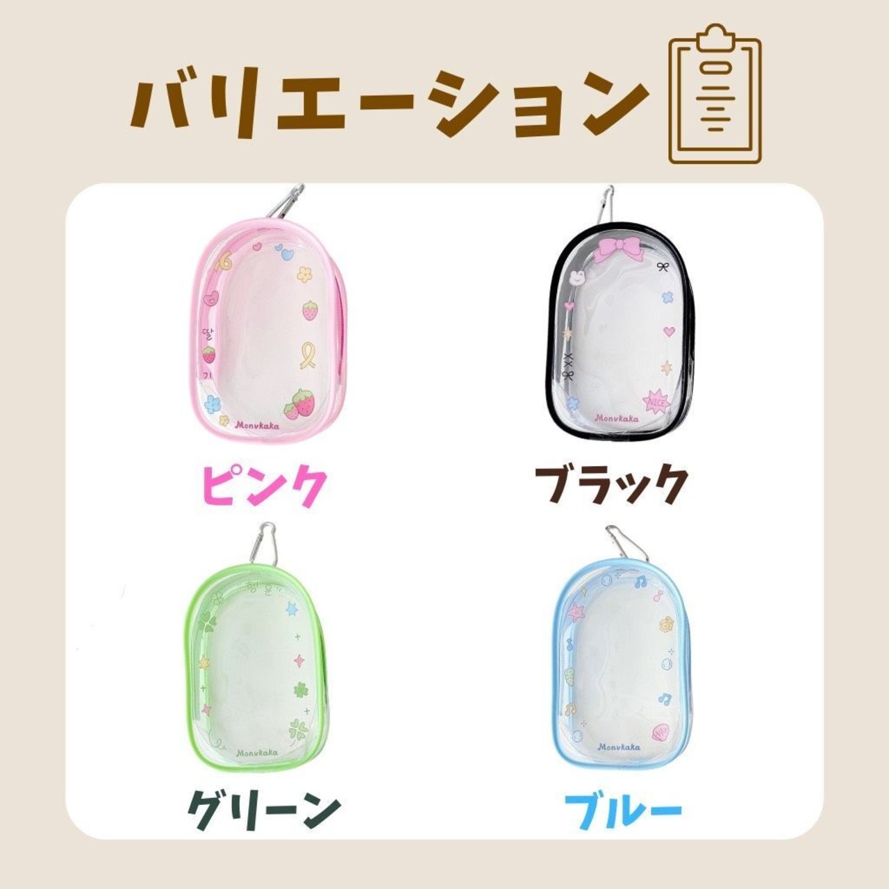 【10cm〜13cm対応】ぬい収納クリアポーチ カラビナ付き 全4色 推し活